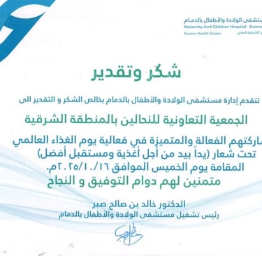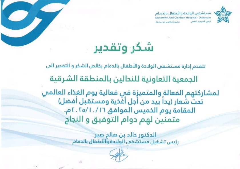 تحت شعار "يدًا بيد من أجل أغذية ومستقبل أفضل"، شاركت الجمعية التعاونية للنحالين بالمنطقة الشرقية بالتعاون مع فرع وزارة البيئة والمياه والزراعة بالمنطقة الشرقية في فعالية توعوية بمناسبة اليوم العالمي للغذاء 2025م، التي أُقيمت في مستشفى الولادة والأطفال بالدمام، وذلك بهدف تعزيز الوعي بأهمية الغذاء الصحي ودوره في بناء مستقبل مستدام.