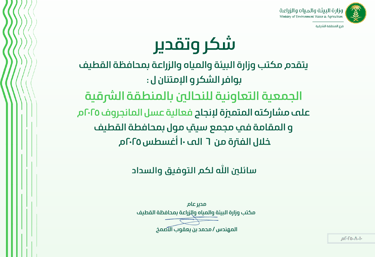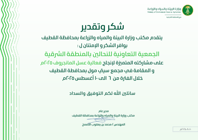 مشاركة الجمعية التعاونية للنحالين التعاونية بالمنطقة الشرقية بـ (مهرجان العسل لعام 2025م) مع وزارة البيئة والمياه والزراعة بالمنطقة الشرقية المقام بالواجهة البحرية بمحافظة القطيف خلال الفترة من 6 اإلى 10 أغسطس 2025م.